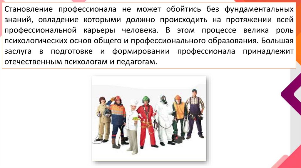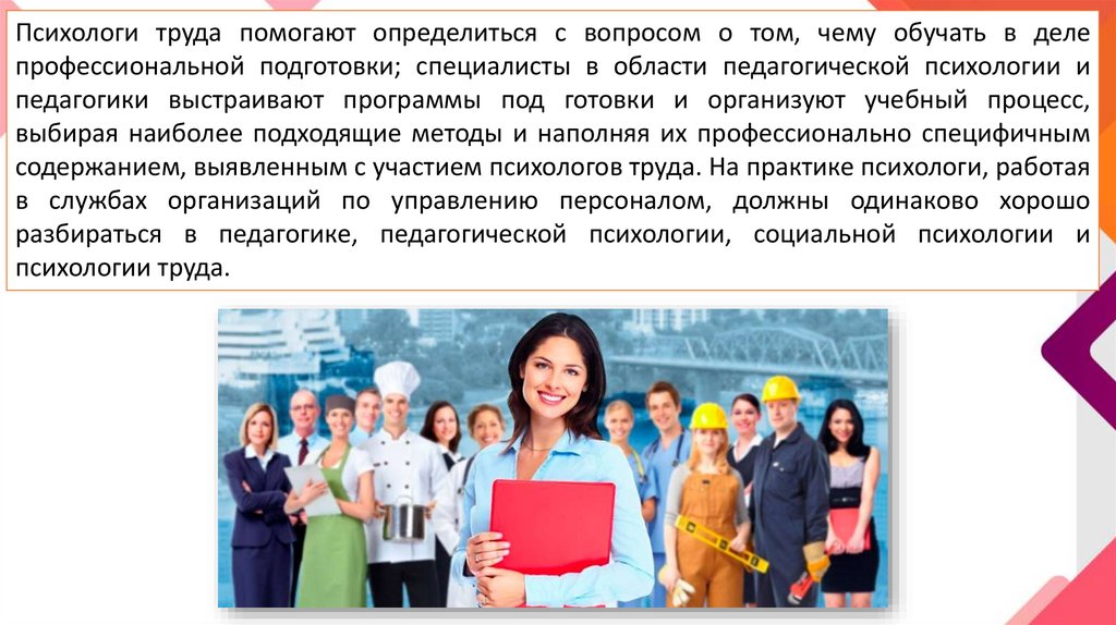 Психологи труда помогают определиться с вопросом о том, чему обучать в делепрофессиональной подготовки; специалисты в области педагогической психологии и