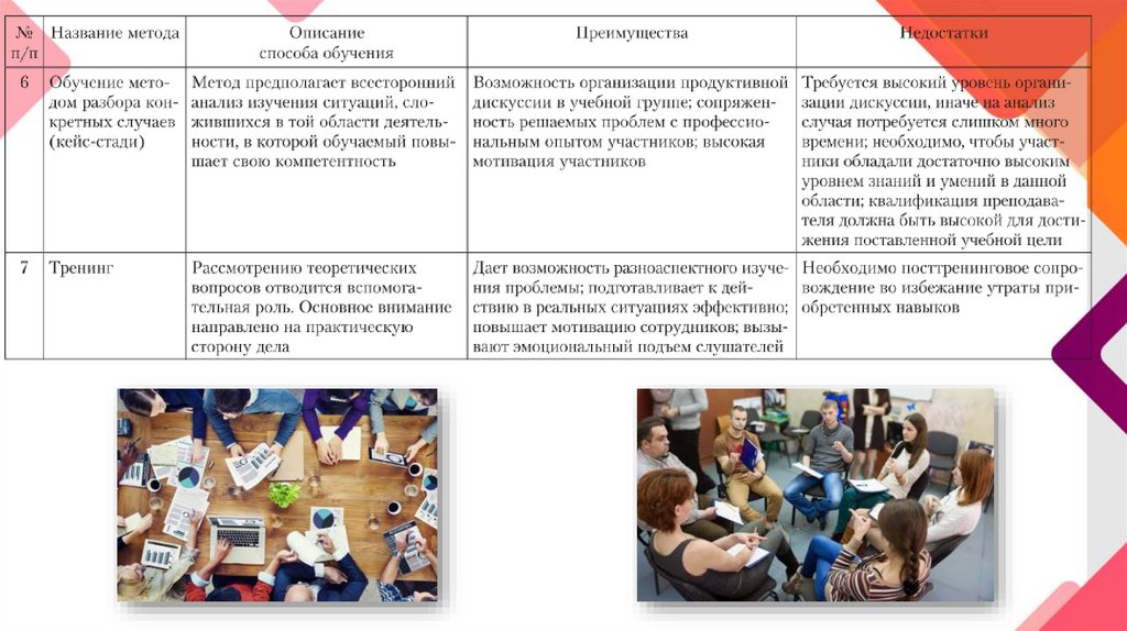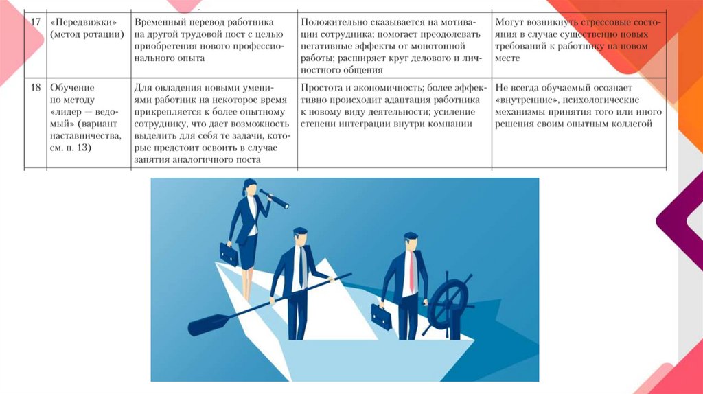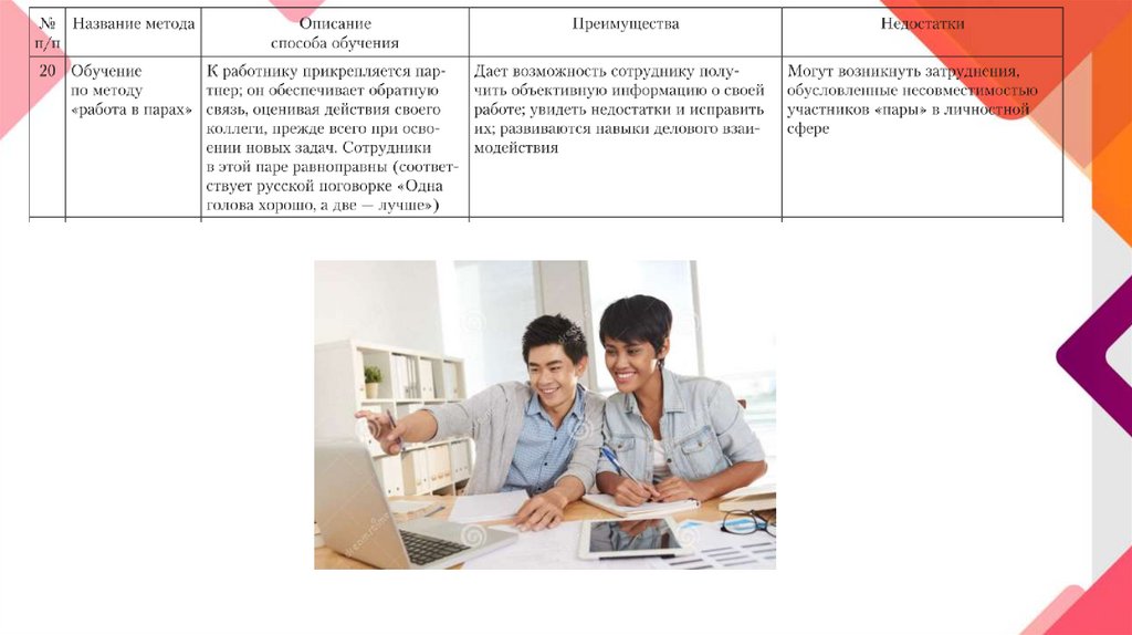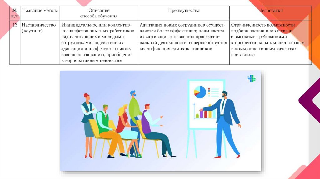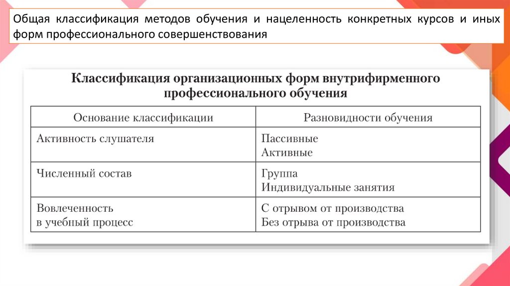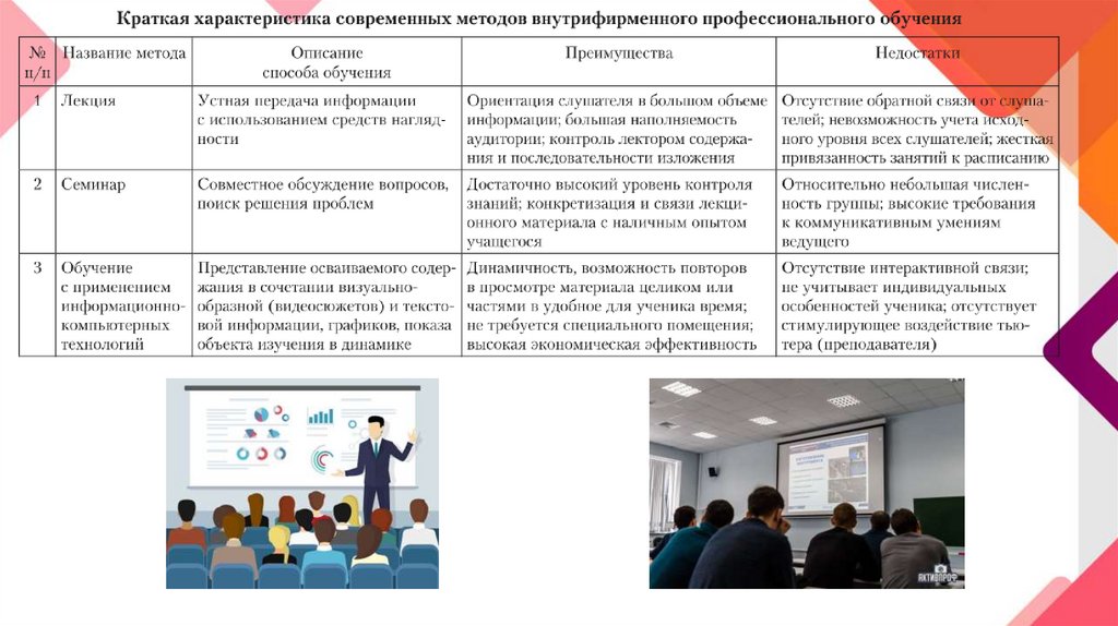 Представленные в таблице методы внутрифирменного профессионального обучения,безусловно, не исчерпывают всего разнообразия методов. Это методы, которые применяют для