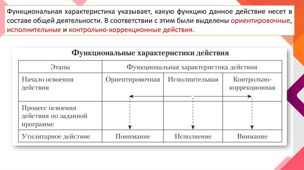 Функциональная характеристика указывает, какую функцию данное действие несет всоставе общей деятельности. В соответствии с этим были выделены ориентировочные,