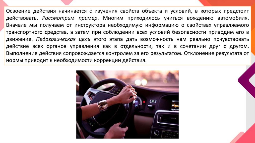 Освоение действия начинается с изучения свойств объекта и условий, в которых предстоитдействовать. Рассмотрим пример. Многим приходилось учиться вождению автомобиля.