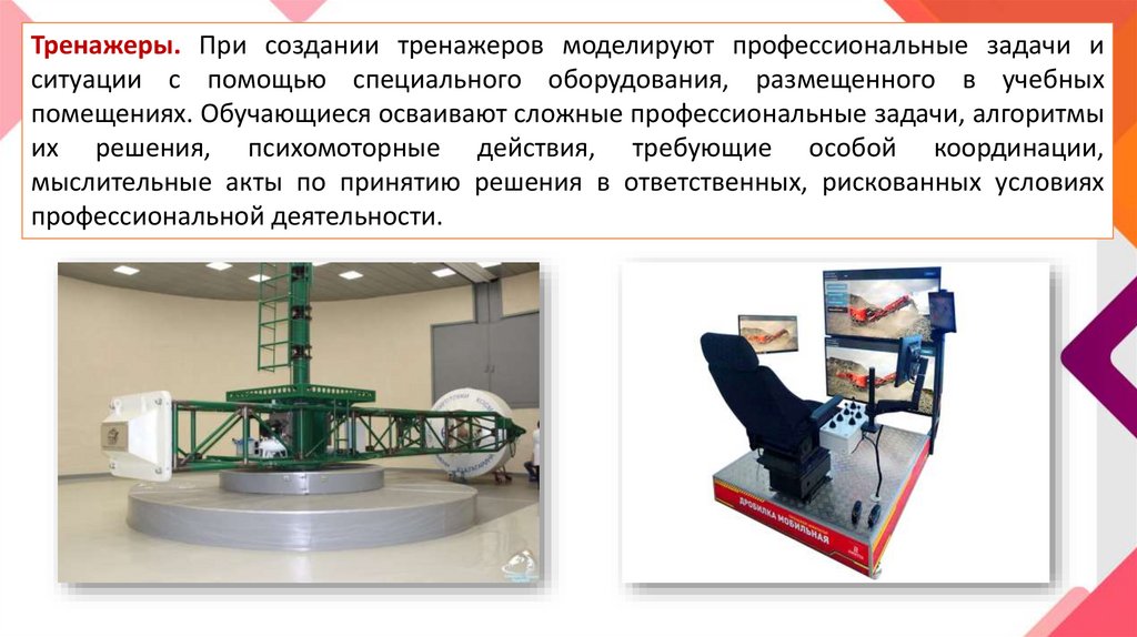 Тренажеры. При создании тренажеров моделируют профессиональные задачи иситуации с помощью специального оборудования, размещенного в учебных
