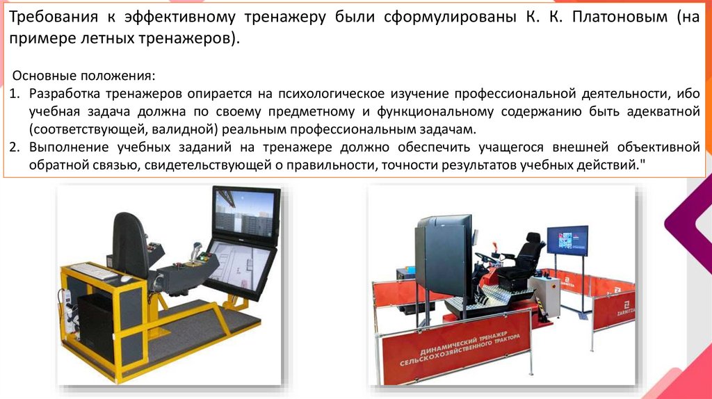 Требования к эффективному тренажеру были сформулированы К. К. Платоновым (напримере летных тренажеров).