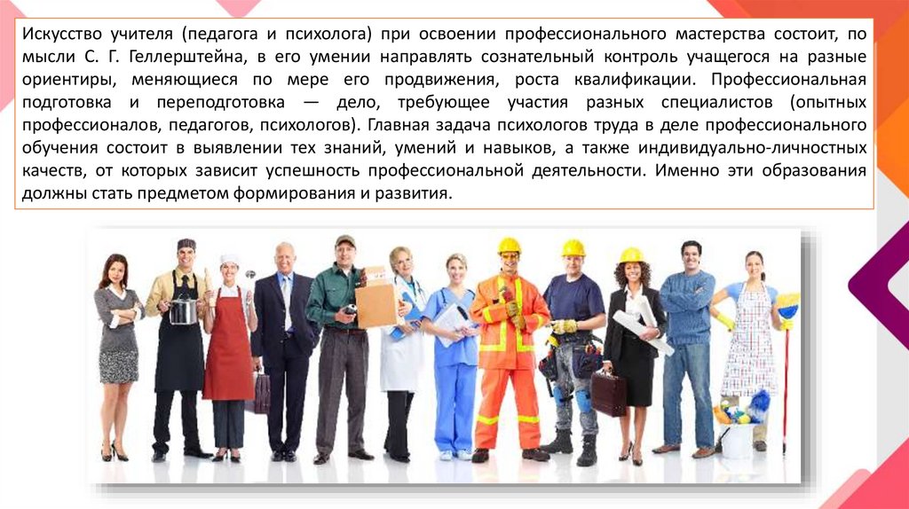 Искусство учителя (педагога и психолога) при освоении профессионального мастерства состоит, помысли С. Г. Геллерштейна, в его умении направлять сознательный контроль учащегося на разные
