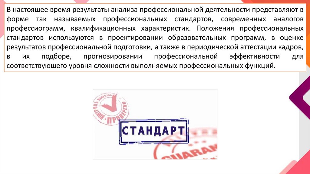 В настоящее время результаты анализа профессиональной деятельности представляют вформе так называемых профессиональных стандартов, современных аналогов