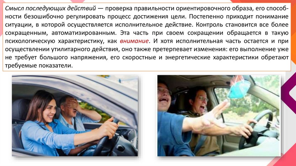 Контрольно-коррекционная часть действия в данном примере состоит в наблюдении затраекторией и плавностью движения, показателем спидометра, шума двигателя и т.д. По мере