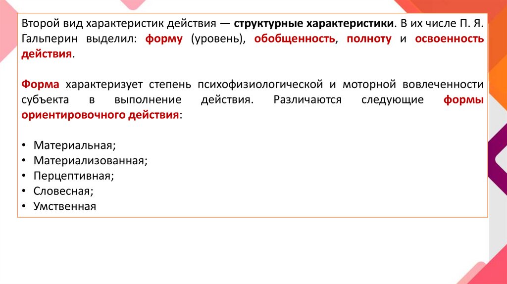 Второй вид характеристик действия — структурные характеристики. В их числе П. Я.Гальперин выделил: форму (уровень), обобщенность, полноту и освоенность