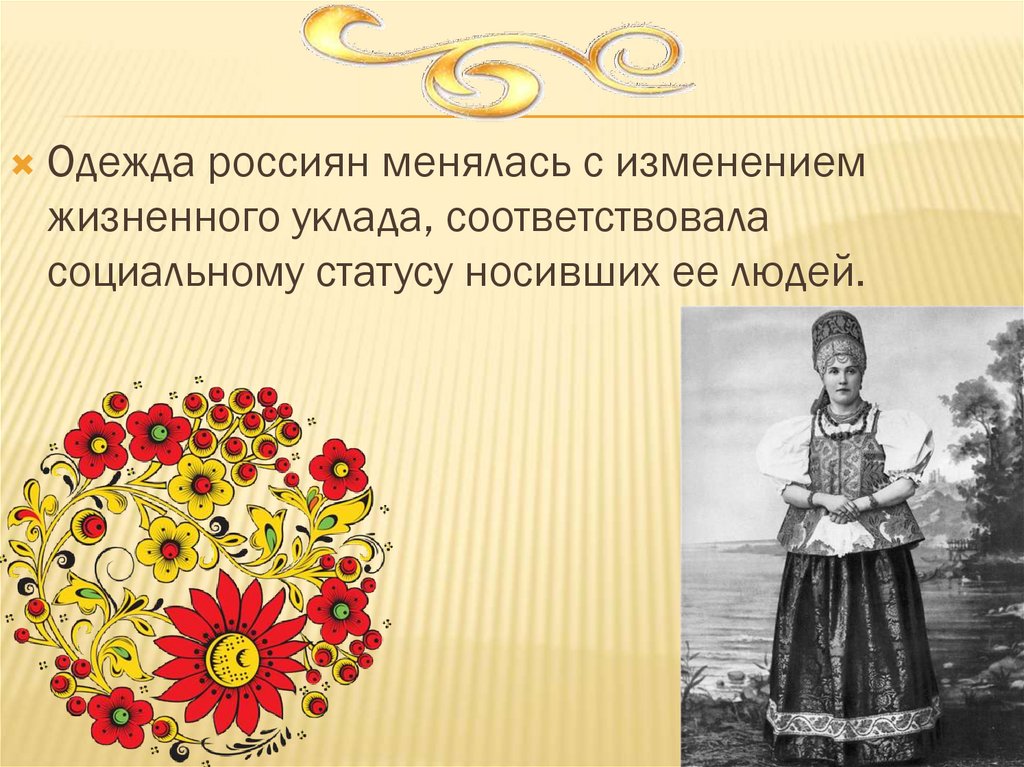 Одежда россиян менялась с изменениемжизненного уклада, соответствовала