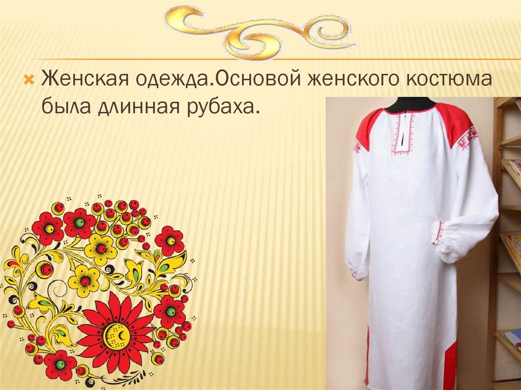 Женская одежда.Основой женского костюмабыла длинная рубаха.