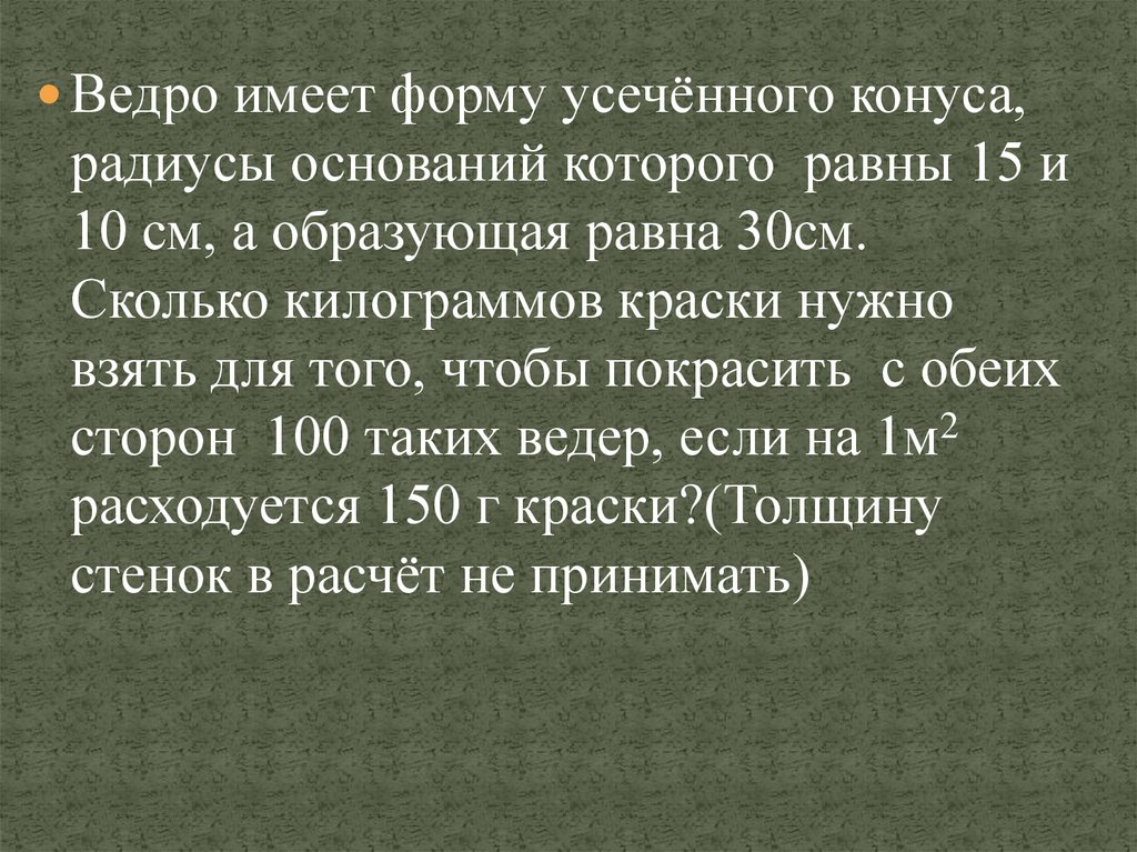 Ведро имеет форму усечённого конуса,радиусы оснований которого равны 15 и