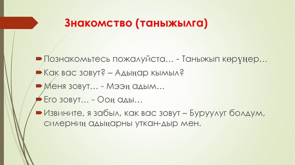 Знакомство (таныжылга)Познакомьтесь пожалуйста… - Таныжып кѳрүӊер…