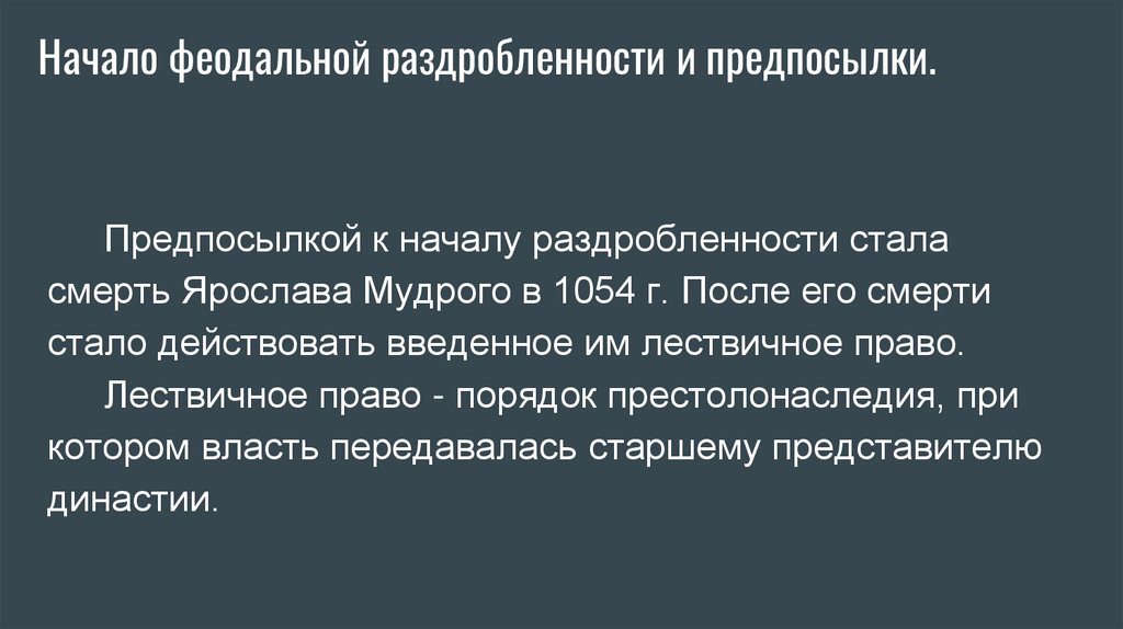 Начало феодальной раздробленности и предпосылки.Предпосылкой к началу раздробленности стала