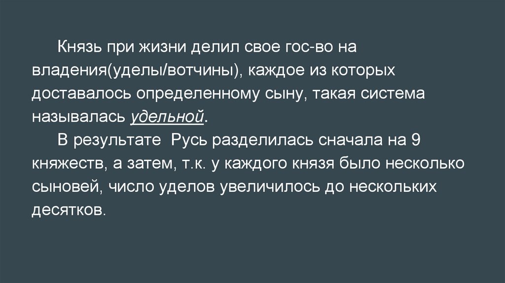 Князь при жизни делил свое гос-во навладения(уделы/вотчины), каждое из которых