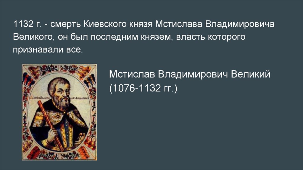1132 г. - смерть Киевского князя Мстислава ВладимировичаВеликого, он был последним князем, власть которого
