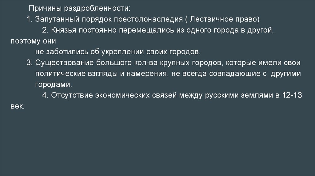 Причины раздробленности:1. Запутанный порядок престолонаследия ( Лествичное право)