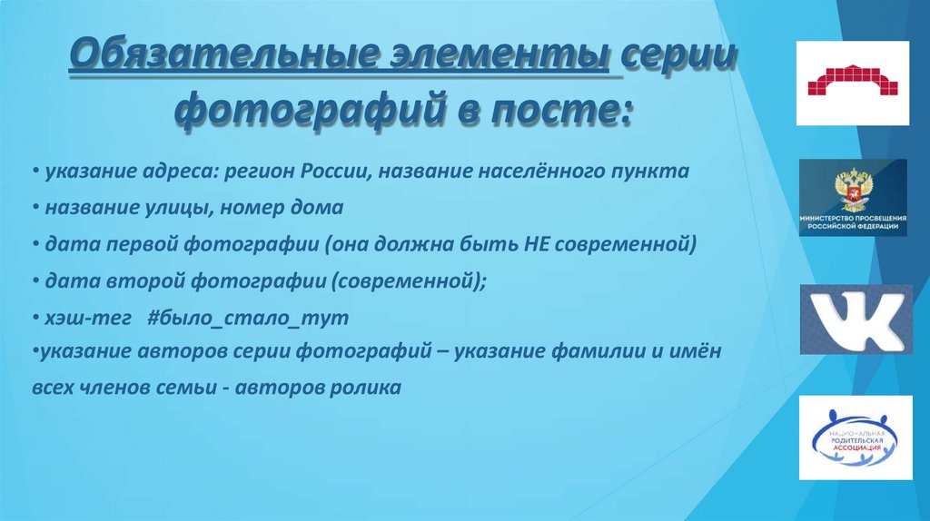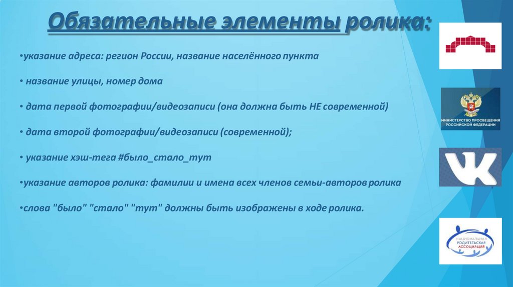 Обязательные элементы ролика:•указание адреса: регион России, название населённого пункта