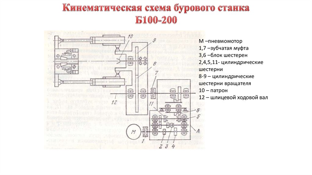 цилиндрические шестерни 8-9 на патрон 10 и буровой став