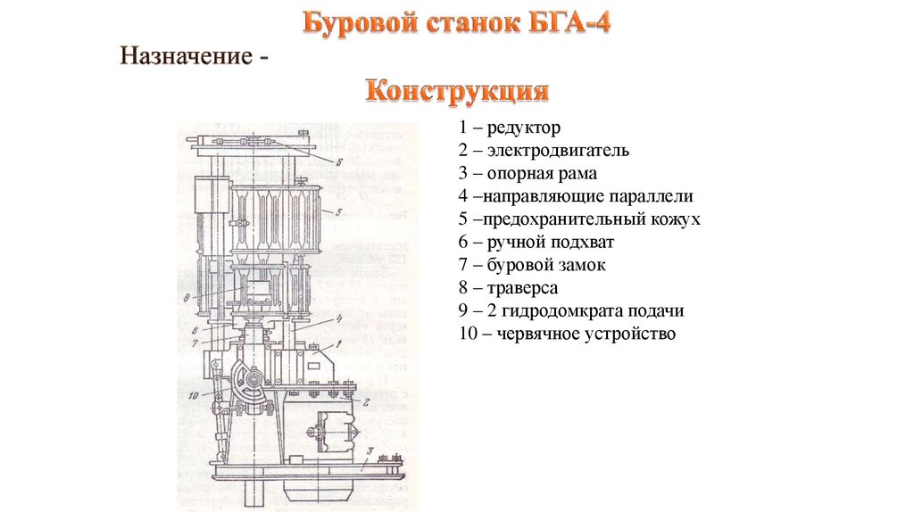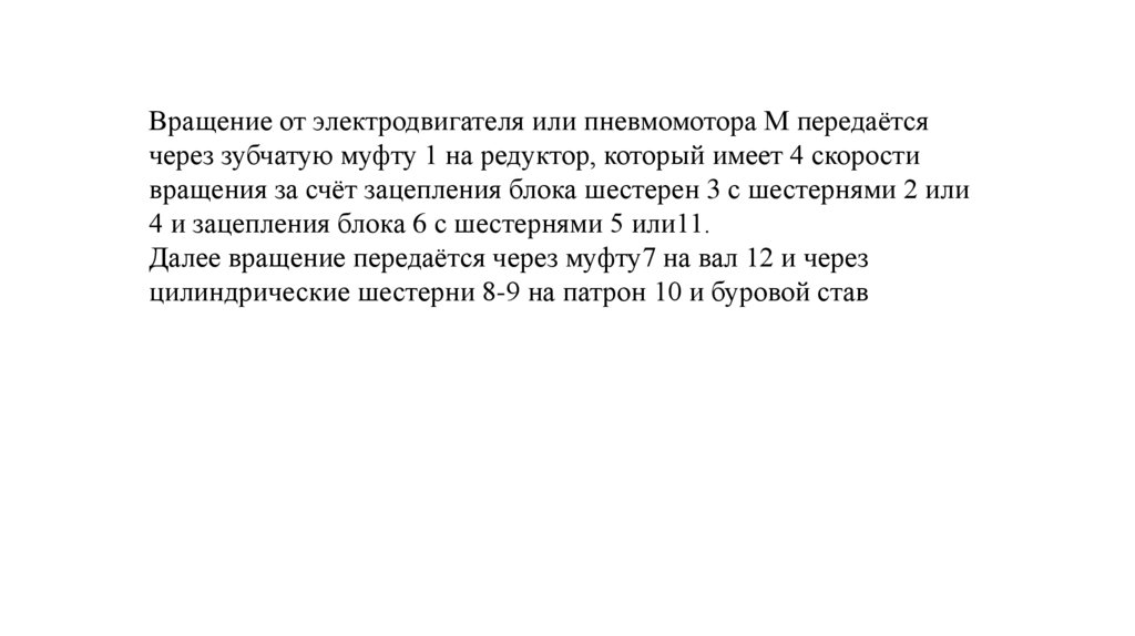 Вращение от электродвигателя или пневмомотора М передаётсячерез зубчатую муфту 1 на редуктор, который имеет 4 скорости