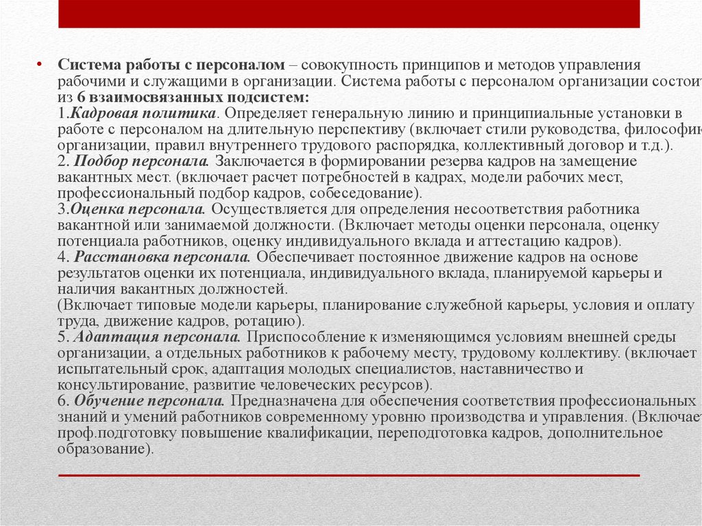 • Система работы с персоналом – совокупность принципов и методов управлениярабочими и служащими в организации. Система работы с персоналом организации состоит