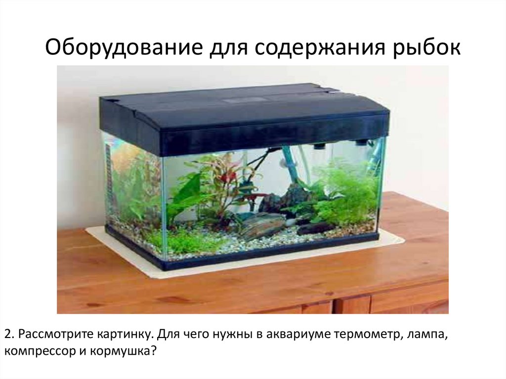 Оборудование для содержания рыбок2. Рассмотрите картинку. Для чего нужны в аквариуме термометр, лампа,