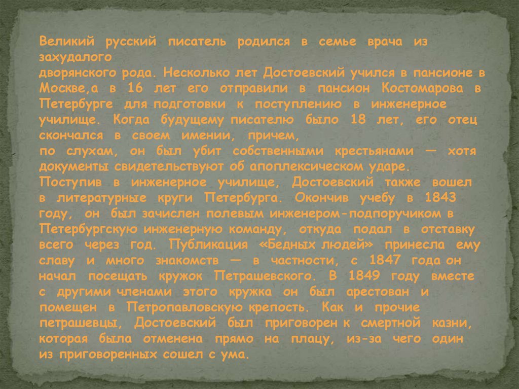 дворянского рода. Несколько лет Достоевский учился в пансионе в