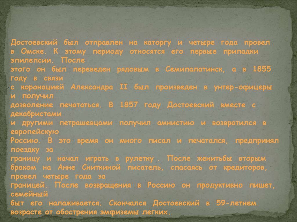 Достоевский был отправлен на каторгу и четыре года провелв Омске. К этому периоду относятся его первые припадки