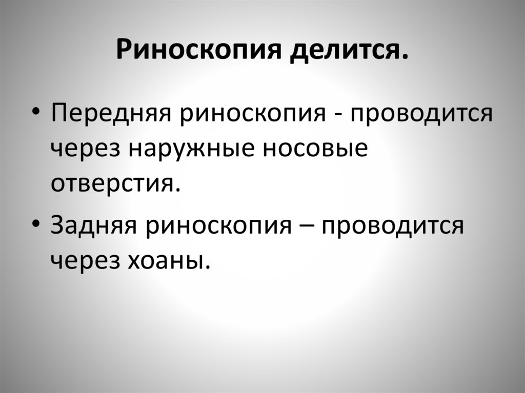 Риноскопия делится.• Передняя риноскопия - проводится