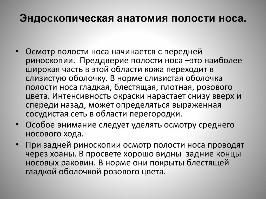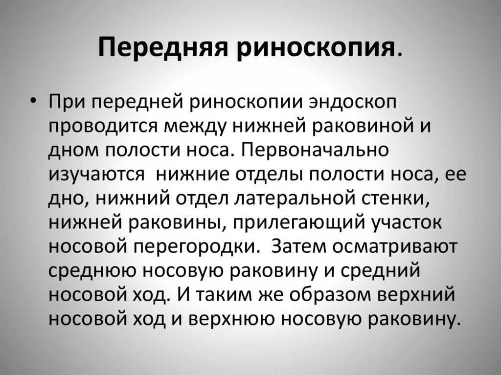 Передняя риноскопия.• При передней риноскопии эндоскоп
