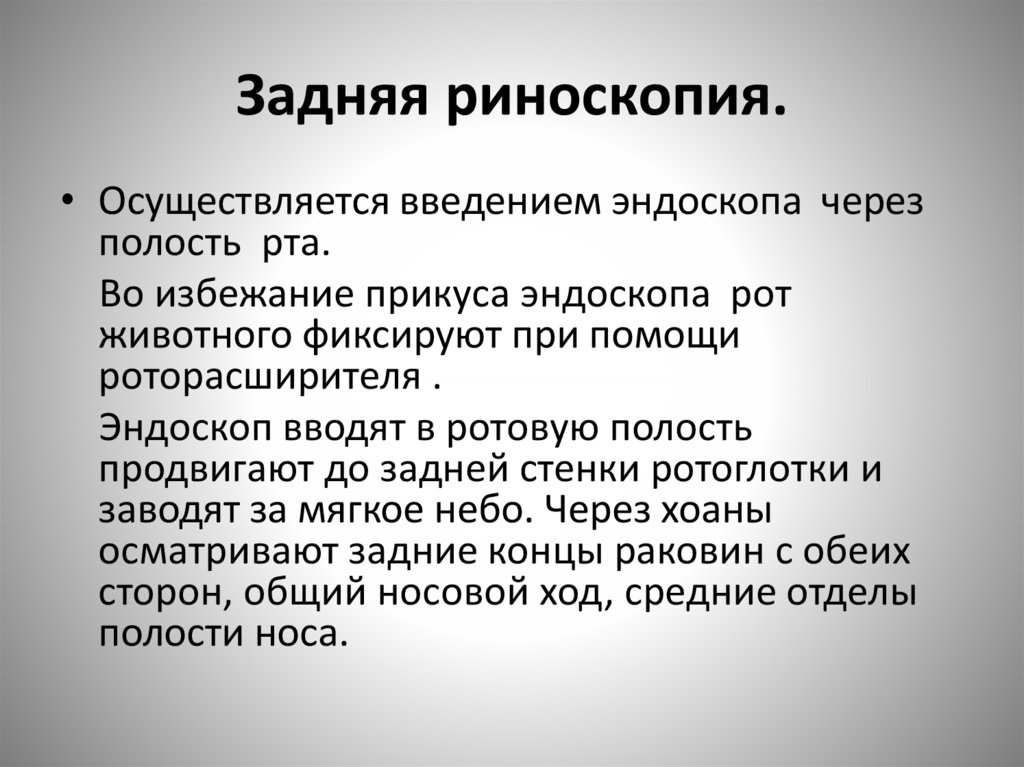 Задняя риноскопия.• Осуществляется введением эндоскопа через