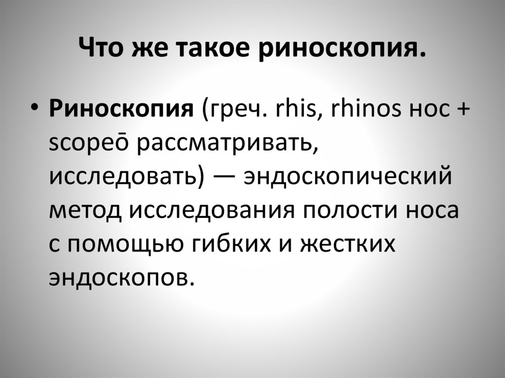 Что же такое риноскопия.• Риноскопия (греч. rhis, rhinos нос +