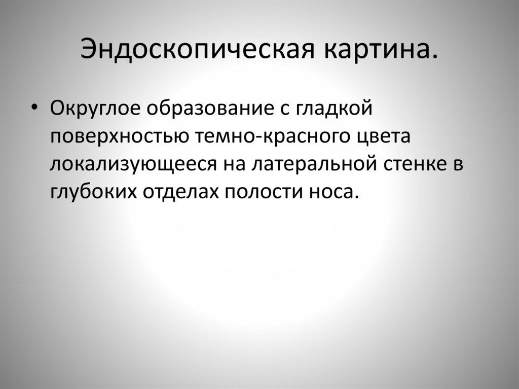 Эндоскопическая картина.• Округлое образование с гладкой