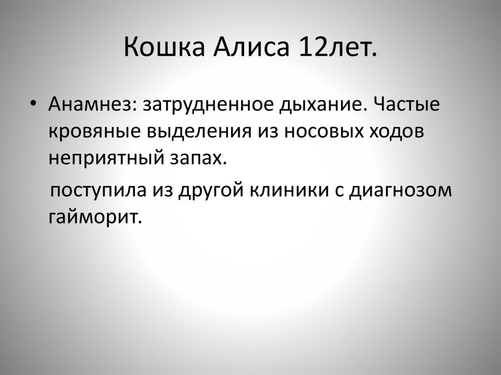 Кошка Алиса 12лет.• Анамнез: затрудненное дыхание. Частые