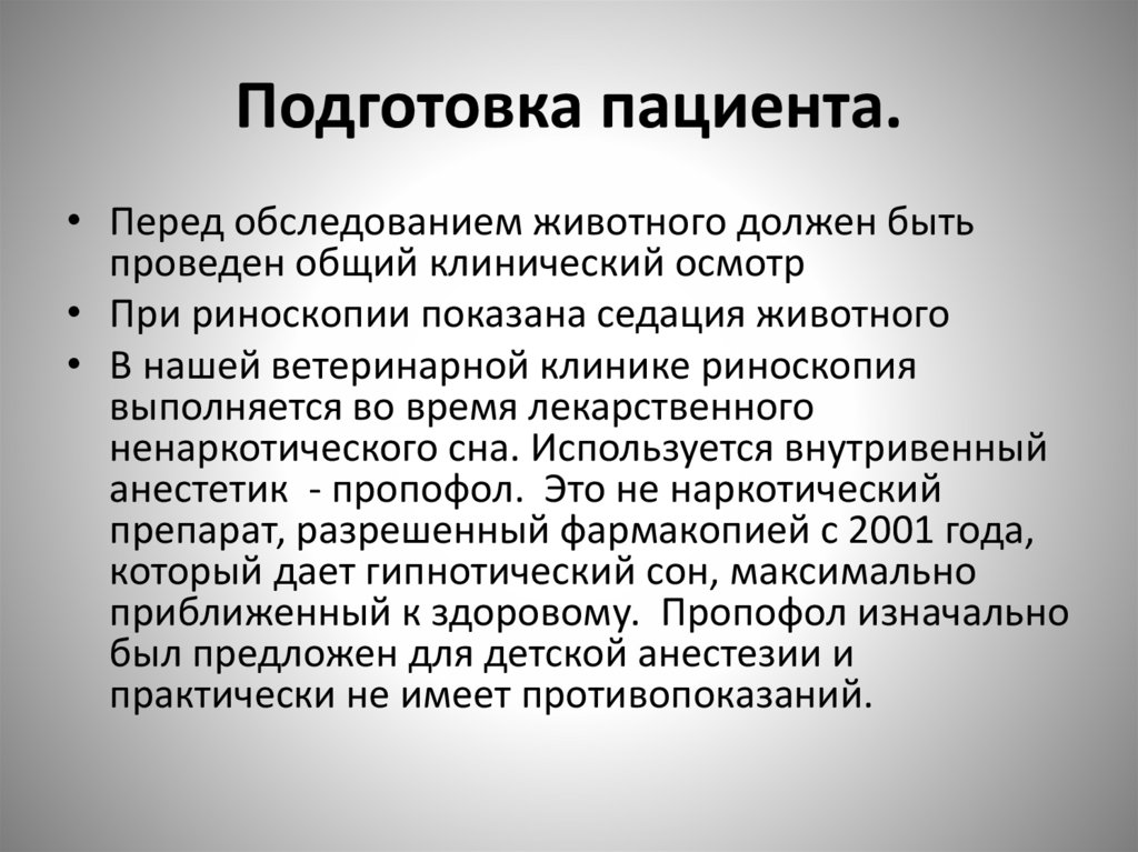 Подготовка пациента.• Перед обследованием животного должен быть