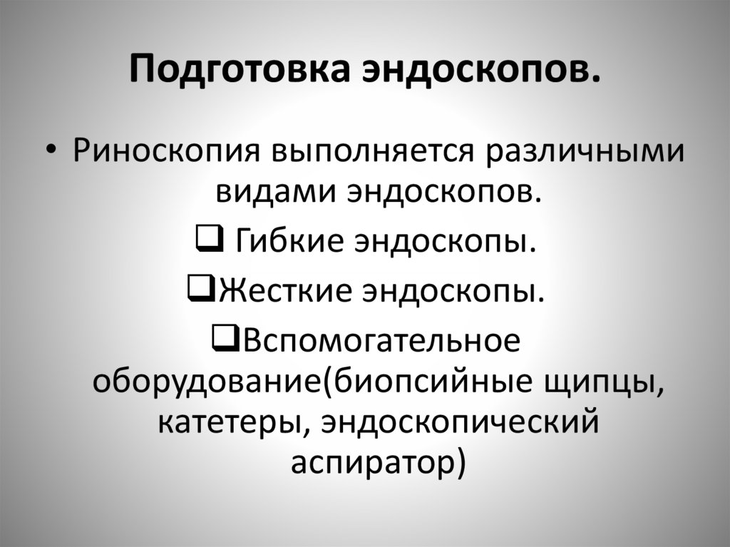 Подготовка эндоскопов.• Риноскопия выполняется различными