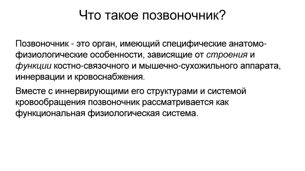 Что такое позвоночник?Позвоночник - это орган, имеющий специфические анатомофизиологические особенности, зависящие от строения и