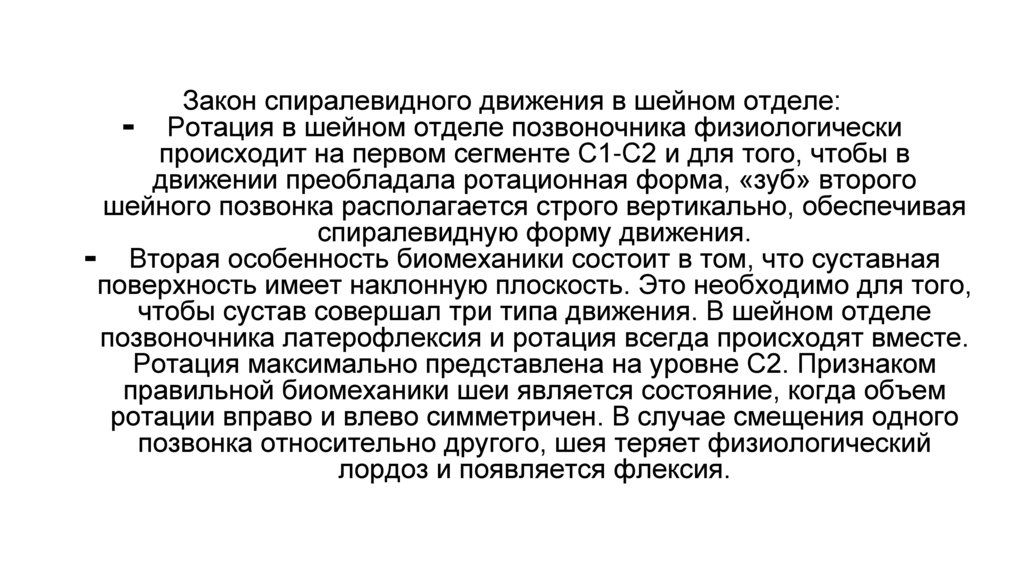 Закон спиралевидного движения в шейном отделе:⁃ Ротация в шейном отделе позвоночника физиологически