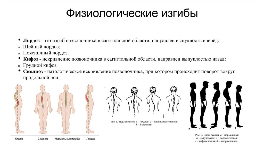 Физиологические изгибыЛордоз - это изгиб позвоночника в сагиттальной области, направлен выпуклость вперёд: