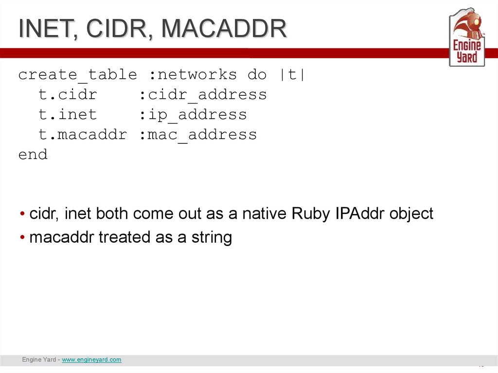 INET, CIDR, MACADDRcreate_table :networks do |t|