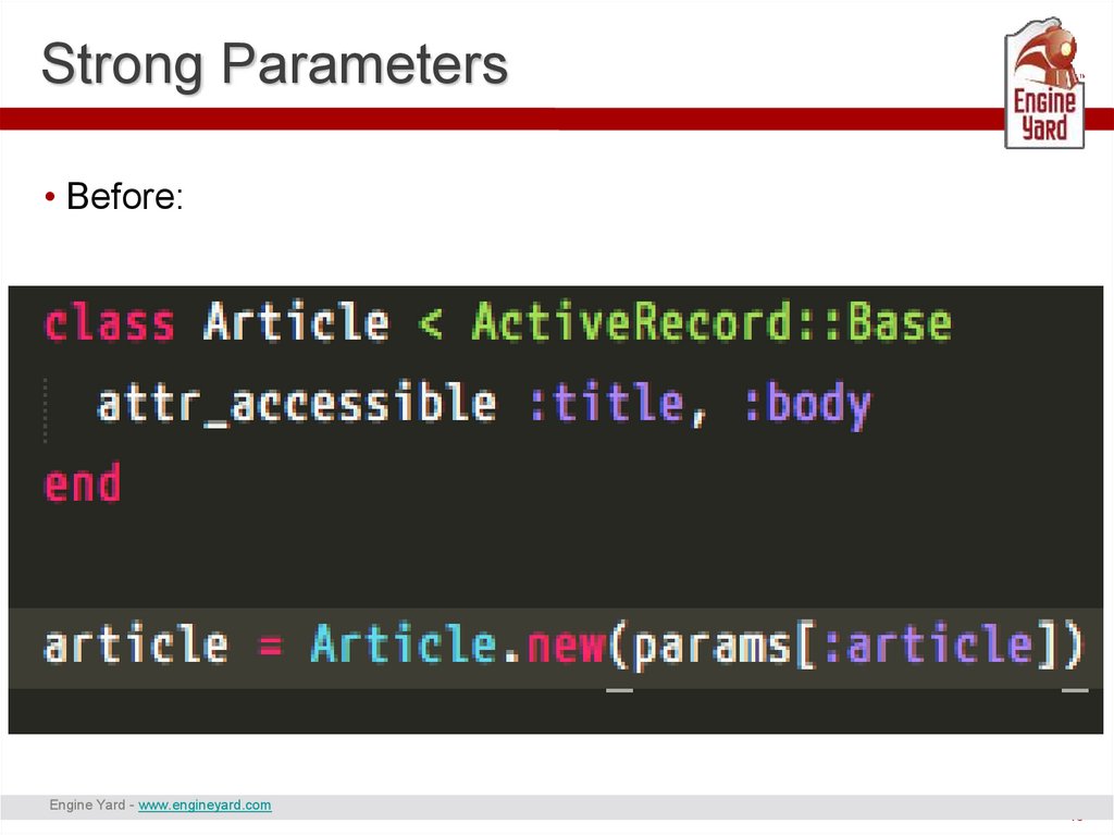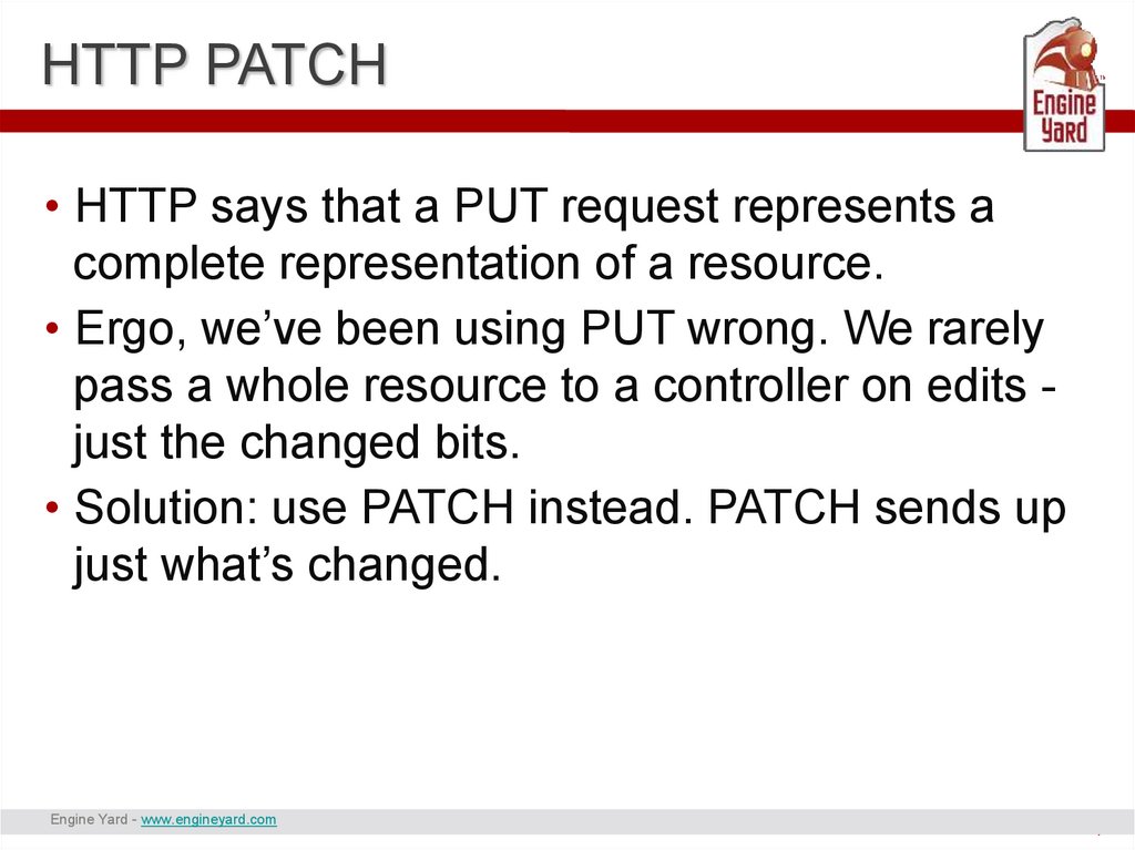 – PATCH :update, article: { author: “foo”, title: “bar”, body: “blah” }