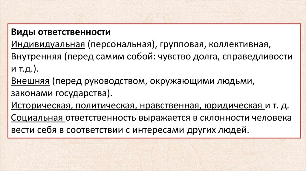 Виды ответственностиИндивидуальная (персональная), групповая, коллективная,