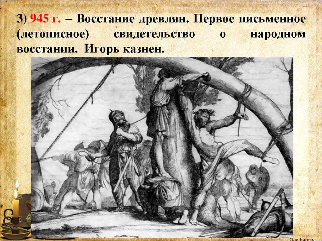 3) 945 г. – Восстание древлян. Первое письменное(летописное)