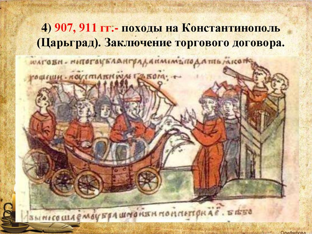 4) 907, 911 гг.- походы на Константинополь(Царьград). Заключение торгового договора.