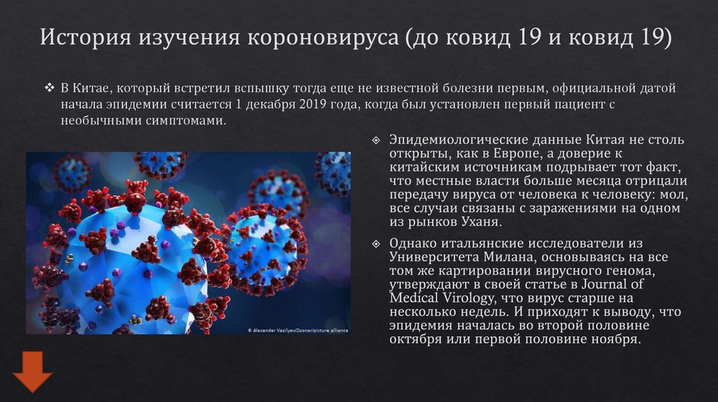 В Китае, который встретил вспышку тогда еще не известной болезни первым, официальной датойначала эпидемии считается 1 декабря 2019 года, когда был установлен первый пациент с
