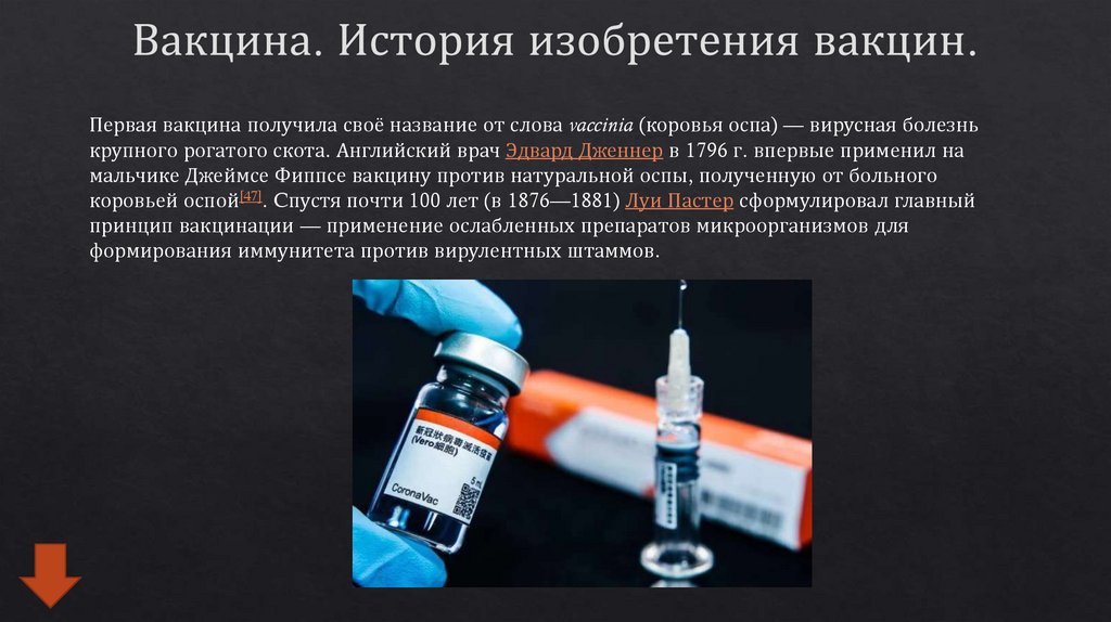 коровьей оспой[47]. Cпустя почти 100 лет (в 1876—1881) Луи Пастер сформулировал главный