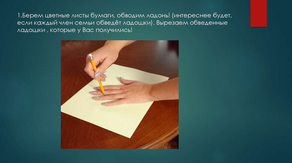 1.Берем цветные листы бумаги, обводим ладонь! (интереснее будет,если каждый член семьи обведёт ладошки). Вырезаем обведенные