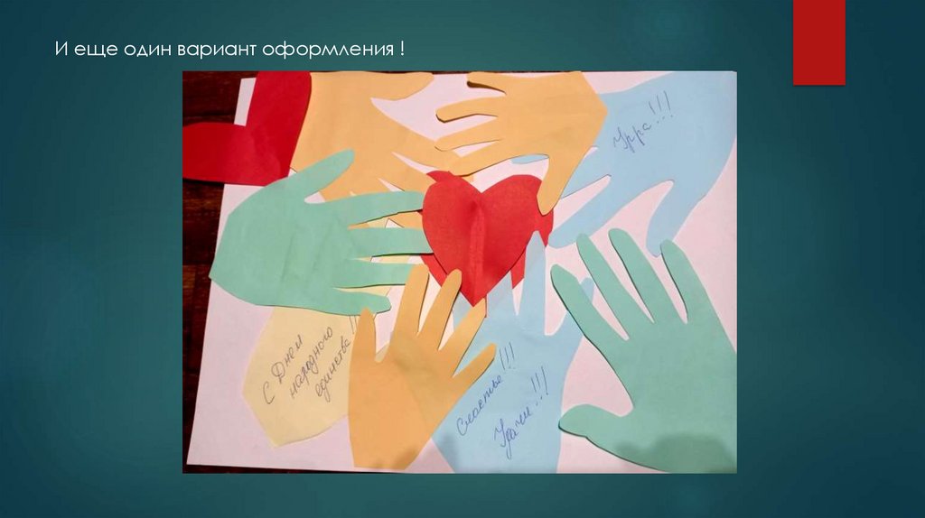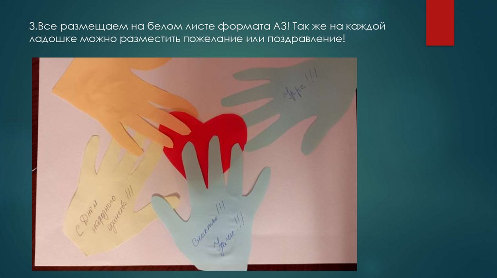 3.Все размещаем на белом листе формата А3! Так же на каждойладошке можно разместить пожелание или поздравление!