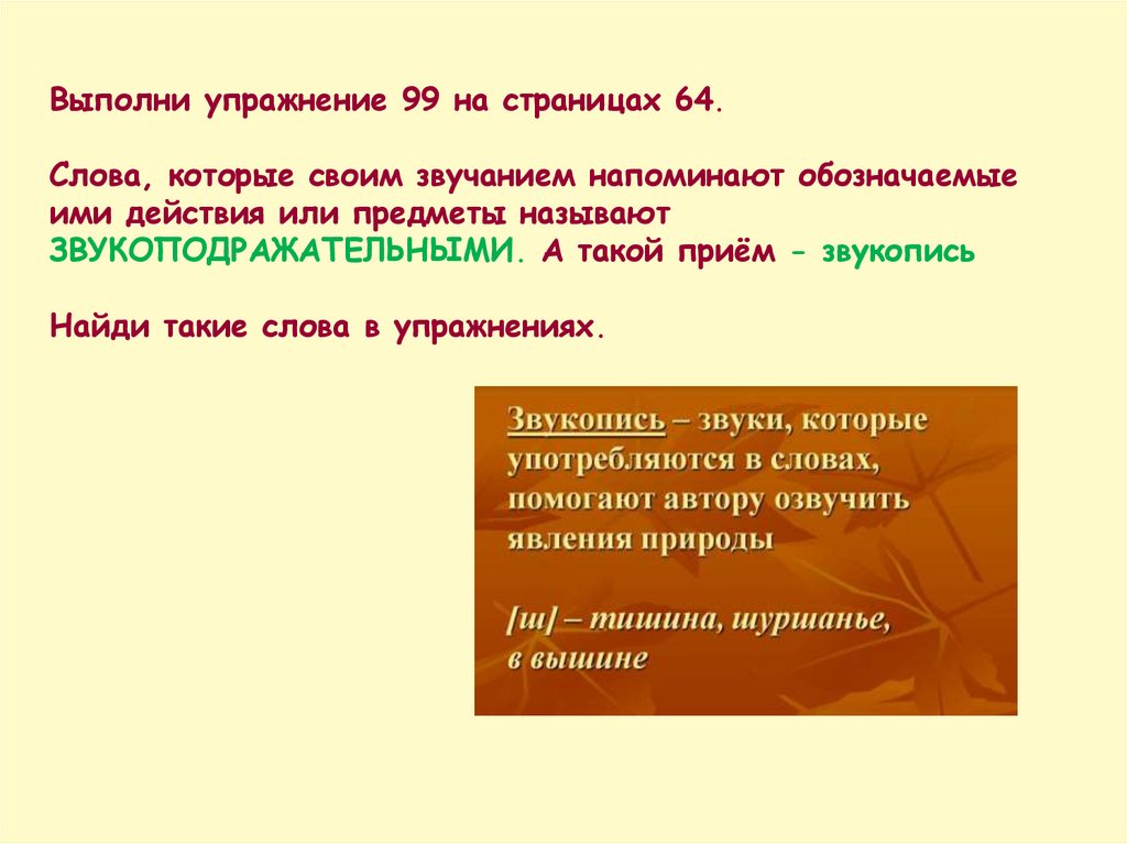 Выполни упражнение 99 на страницах 64.Слова, которые своим звучанием напоминают обозначаемые