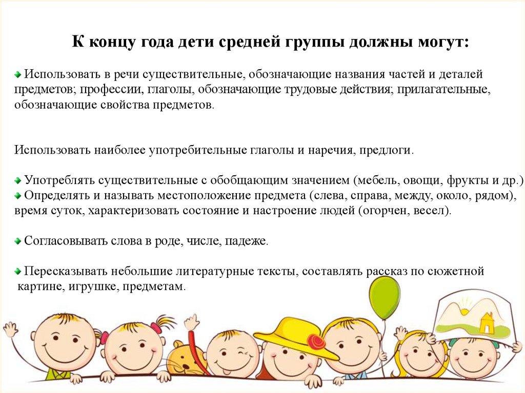 К концу года дети средней группы должны могут:Использовать в речи существительные, обозначающие названия частей и деталей