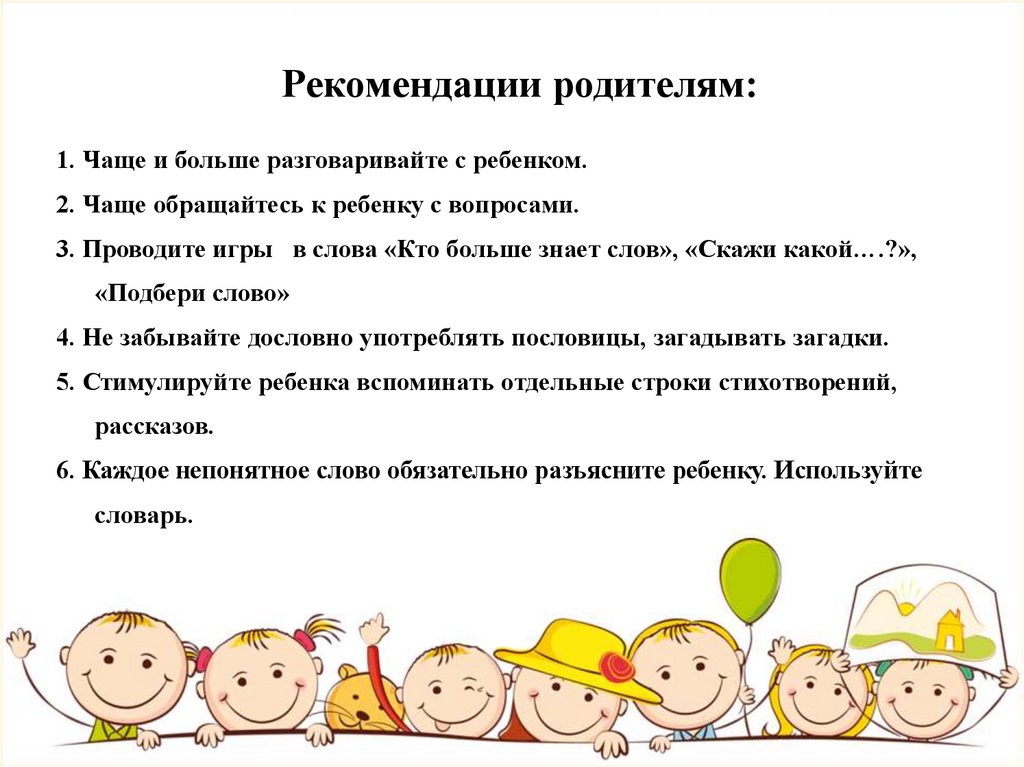 Рекомендации родителям:1. Чаще и больше разговаривайте с ребенком.