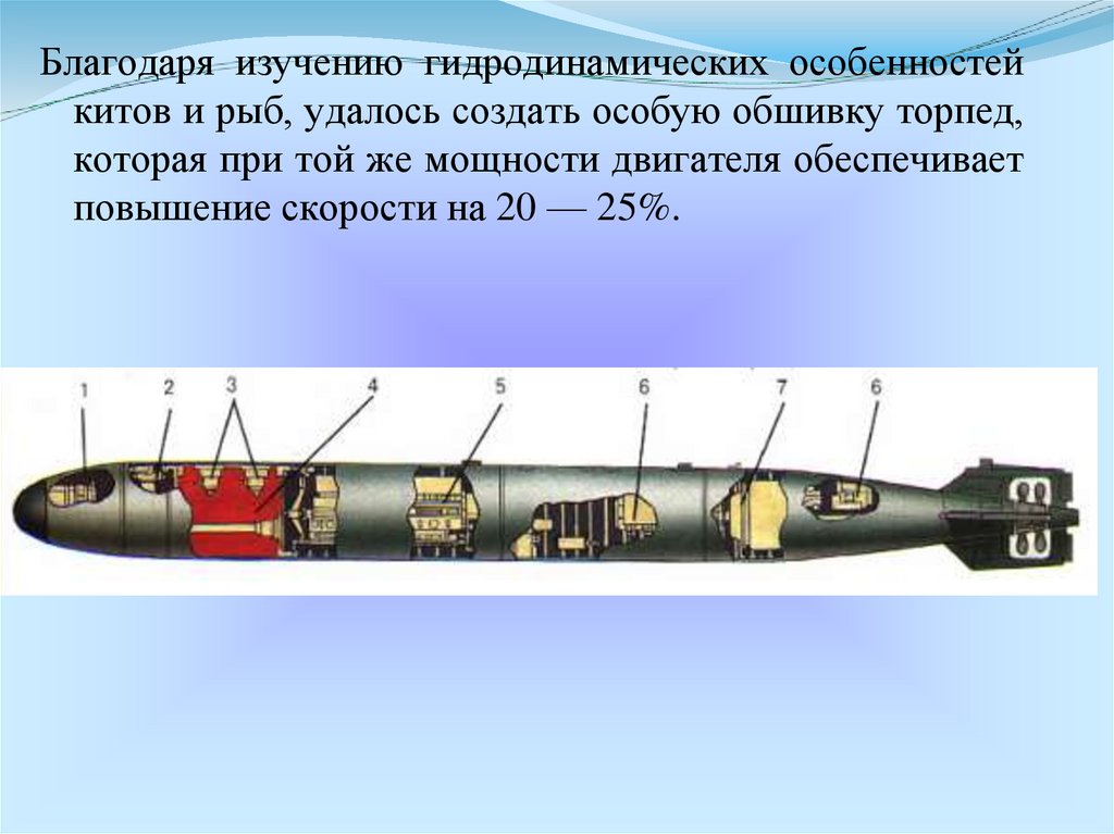 Благодаря изучению гидродинамических особенностейкитов и рыб, удалось создать особую обшивку торпед,
