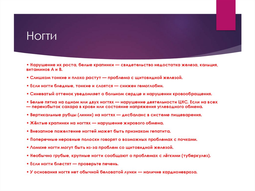 Ногти• Нарушение их роста, белые крапинки — свидетельство недостатка железа, кальция,